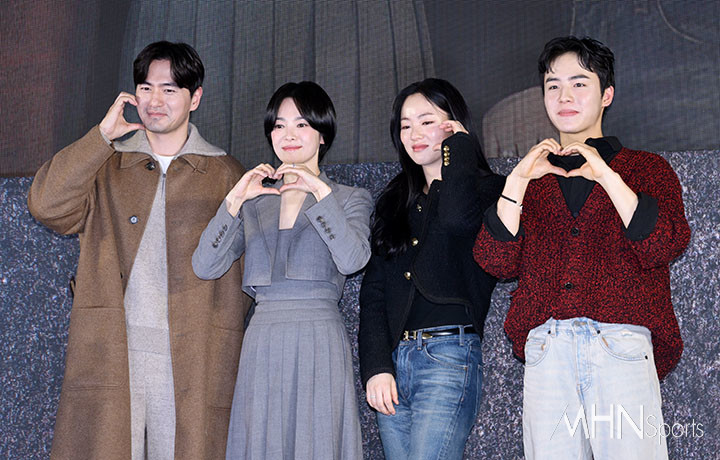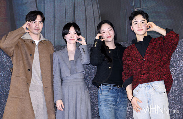 (MHN스포츠 이지숙 기자) 배우 이진욱, 송혜교, 전여빈, 문우진이 14일 오후 서울 송파구 롯데시네마 월드타워에서 진행된 영화 '검은 수녀들' 쇼케이스에 참석해 포즈를 취하고 있다.