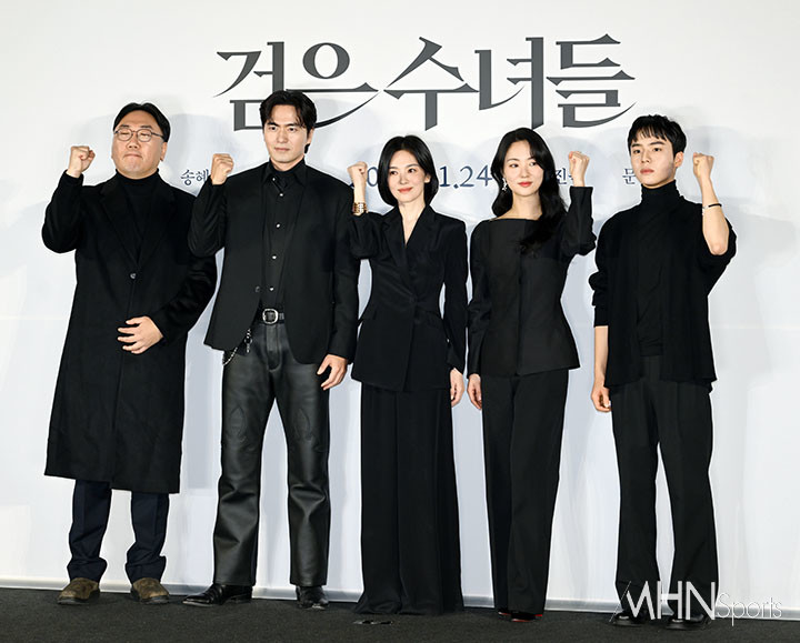 (MHN스포츠 이지숙 기자) 권혁재 감독, 배우 이진욱, 송혜교, 전여빈, 문우진이 16일 오전 서울 용산구 CGV용산아이파크몰에서 열린 영화 '검은 수녀들'(감독 권혁재) 제작보고회에 참석해 포즈를 취하고 있다.