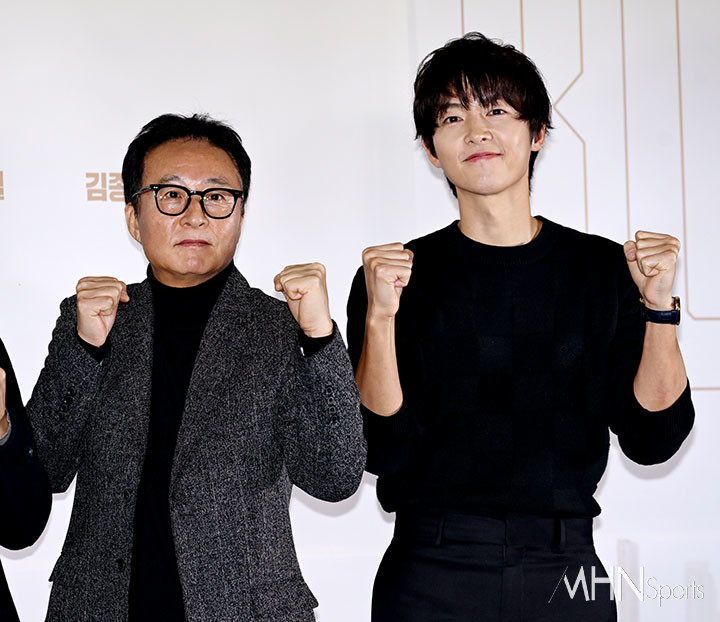 (MHN스포츠 이지숙 기자) 배우 김종수, 송중기가 19일 오후 서울 강남구 메가박스 코엑스에서 진행된 영화 '보고타: 마지막 기회의 땅'(김성제 감독) 언론 시사회에 참석해 포즈를 취하고 있다.