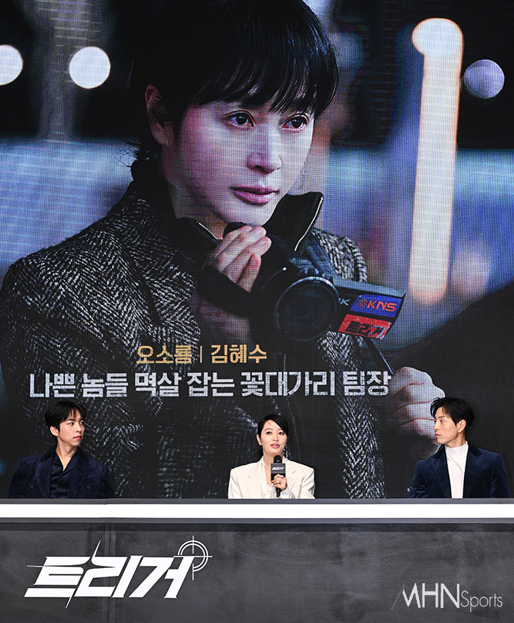 (MHN스포츠 이현지 기자) 배우 김혜수가 8일 오전 서울 영등포구 콘래드 서울 호텔에서 진행된 '트리거' 제작발표회에 참석해 질문에 답하고 있다.