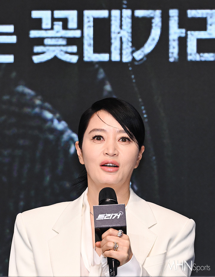 (MHN스포츠 이현지 기자) 배우 김혜수가 8일 오전 서울 영등포구 콘래드 서울 호텔에서 진행된 '트리거' 제작발표회에 참석해 질문에 답하고 있다.