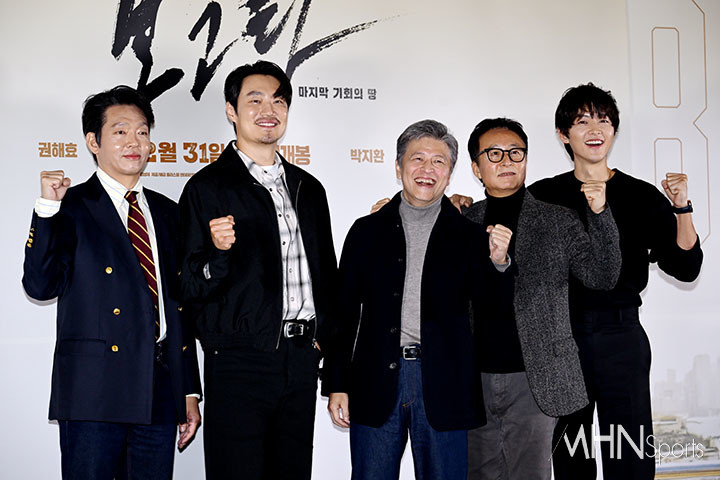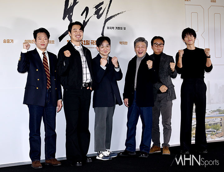 (MHN스포츠 이지숙 기자) 배우 박지환, 이희준, 김성제 감독, 권해효, 김종수, 송중기가 19일 오후 서울 강남구 메가박스 코엑스에서 진행된 영화 '보고타: 마지막 기회의 땅'(김성제 감독) 언론 시사회에 참석해 포즈를 취하고 있다.