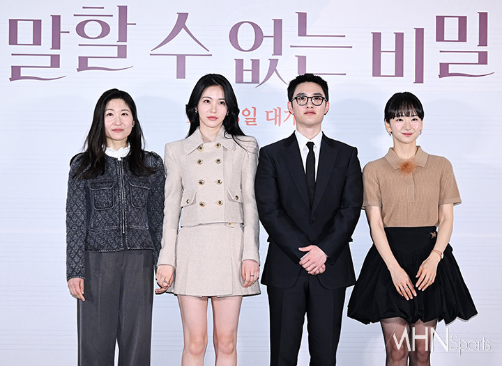 (MHN스포츠 이현지 기자) 서유민 감독, 배우 신예은, 도경수, 원진아가 14일 오후 서울 강남구 메가박스 코엑스점에서 진행된 영화 '말할 수 없는 비밀' 언론시사회 및 기자간담회에 참석해 포토타임을 갖고 있다.