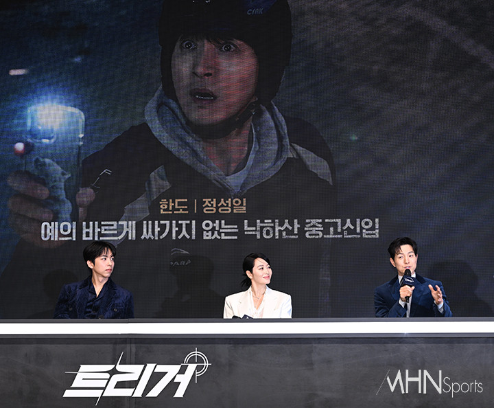 (MHN스포츠 이현지 기자) 배우 정성일이 8일 오전 서울 영등포구 콘래드 서울 호텔에서 진행된 '트리거' 제작발표회에 참석해 질문에 답하고 있다.