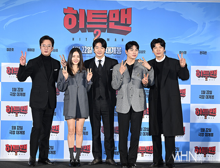 (MHN스포츠 이현지 기자) 배우 정준호, 황우슬혜, 권상우, 이이경, 김성오가 27일 오전 서울 용산구 CGV아이파크몰에서 진행된 영화 '히트맨2' 제작보고회에 참석해 포토타임을 갖고 있다.