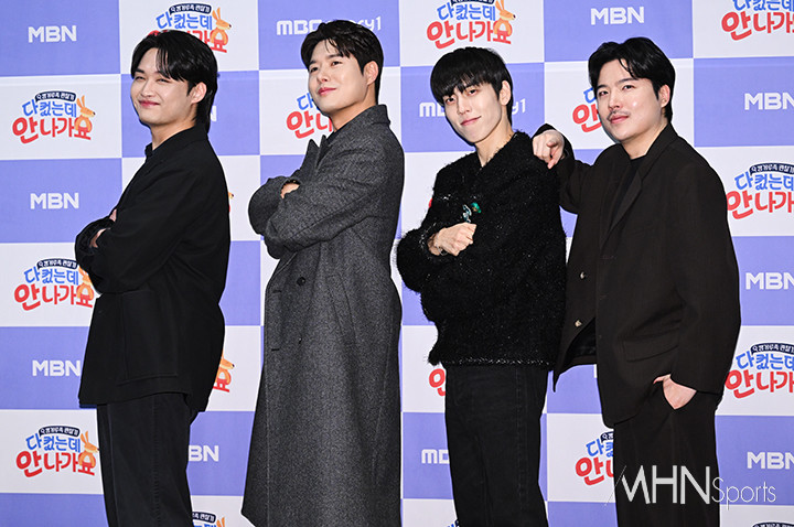 (MHN스포츠 이현지 기자) 황성재, 신정윤, 장동우, 지조가 17일 오전 서울 마포구 스탠포드호텔에서 진행된 예능 '다 컸는데 안 나가요' 제작발표회에 참석해 포토타임을 갖고 있다.