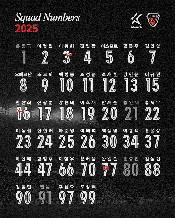 포항스틸러스가 2025시즌 선수단 등번호를 공개했다. 선수단 39명의 배번을 확정한 가운데 재계약을 통해 기존 전력을 많이 유지해 대부분의 선수가 같은 번호를 달고 뛴다. 주장 완델손(77번), 부주장 한찬희(16번), 이동희(3번) 등 27명의 선수는 지난해와 동일한 번호를 사용한다.