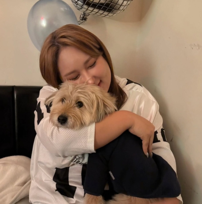 공개된 사진 속 풍자는 웃는 표정으로 강아지를 품에 안고 있다.