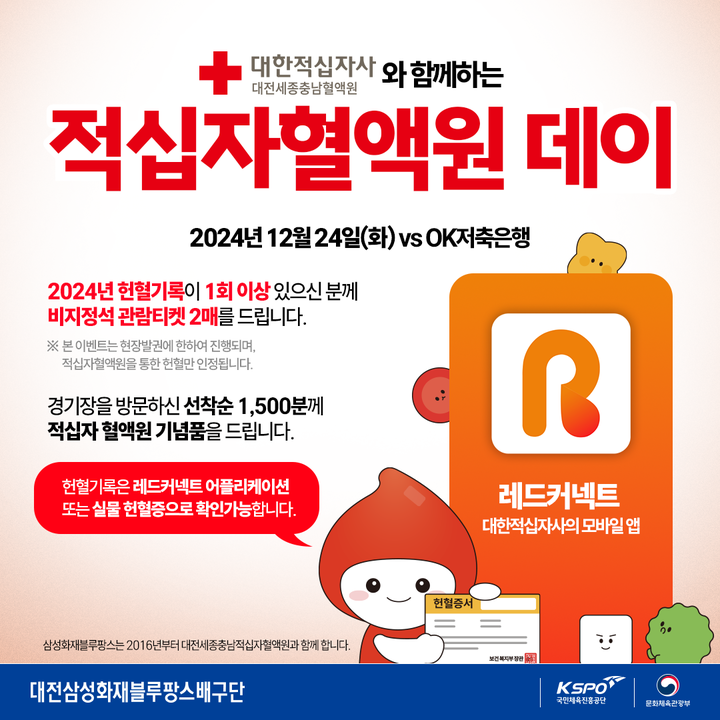 적십자혈액원 데이 헌혈자 초청 관련 자세한 내용은 구단 공식 SNS에서 확인할 수 있다.