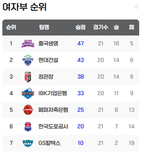 현대건설(승점 43점)과 정관장(승점 38점)이 각각 2위와 3위에 올라 흥국생명을 바짝 추격하고 있으나, 당일 승리로 흥국생명은 한층 안정적인 리드를 확보했다. 중위권에서는 IBK기업은행이 11승 9패(승점 33점)로 4위 자리를 지키고 있다.