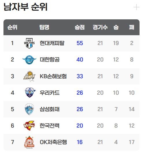 현대캐피탈은 여전히 독보적인 성적으로 1위를 지키고 있다. 19승 2패로 승점 55점을 기록하며, 2위 대한항공(승점 40점)과 큰 격차를 유지하고 있다. 대한항공과 KB손해보험이 그 뒤를 잇고 있지만, 현대캐피탈의 강세가 돋보인다.