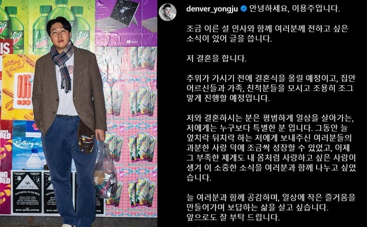 이용주는 "그동안 늘 엎치락 뒤치락 하는 저에게 보내주신 여러분들의 과분한 사랑 덕에 조금씩 성장할 수 있었고, 이제 그 부족한 제게도 내 몸처럼 사랑하고 싶은 사람이 생겨 이 소중한 소식을 여러분과 함께 나누고 싶었다"며 결혼 소식을 전하게 된 배경을 설명했다.