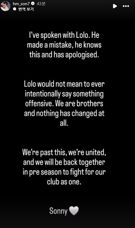이에 벤탄쿠르는 단 24시간만 유지되는 SNS의 '스토리' 기능으로 사과문을 게시했다. 그러나 손흥민의 이름 철자까지 틀린데다 사과문의 형식으로 인해 진정성에 의심을 받으며 비난이 더욱 거세졌다.