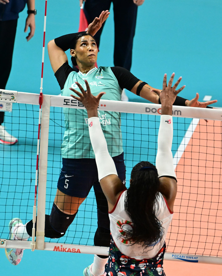 현대건설이 25일 서울 장충체육관에서 열린 2024-25시즌 도드람 V-리그 3라운드 여자부 경기에서 GS칼텍스를 세트스코어 3-0(34-32, 25-18, 25-21)로 꺾었다.