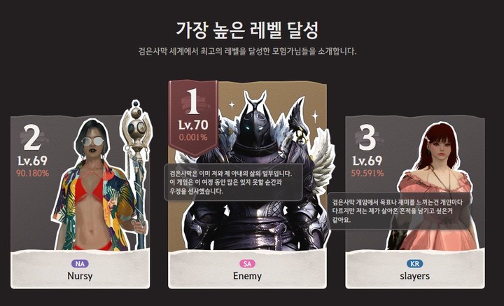 한편, 펄어비스는 10주년을 맞이해 게임 내 기록을 공개했다. 펄어비스에 따르면, 검은사막 내 가장 높은 레벨은 70으로 해당 캐릭터의 주인은 남미 권역 유저로 상위 0.001%이다. 북미 권역과 한국 권역 모험가가 69레벨로 그 뒤를 이었다.