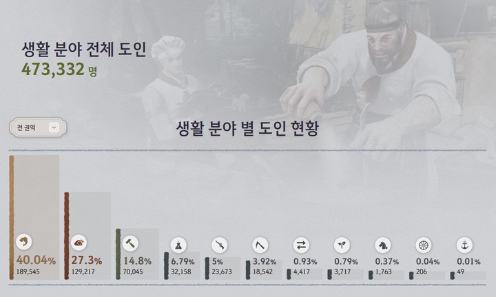 검은 사막 내 생활 콘텐츠의 숙련 레벨은 초급과 견습, 숙련, 전문, 장인, 명장, 도인 순으로 구분돼 있다. 이 중 최고 레벨인 도인을 가장 많이 배출한 콘텐츠는 낚시이며, 총 18만9545명이 도인을 달성한 것으로 전해진다.