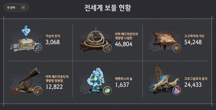 검은사막 내에서 다른 유저를 현재 내 위치로 소환할 수 있는 '라피 베드마운틴의 개량형 나침반'은 총 4만6804명이 제작해 소유했으며, 편의품인 '라피 베드마운틴의 개령형 망원경'은 1만2822명, 거상의 반지는 3068명이 소유했다. 이 중 가까운 마을로 이동 및 이동 전 위치로 되돌아갈 수 있는 '고고학자의 지도'는 가장 선호하는 보물로 선정됐다.