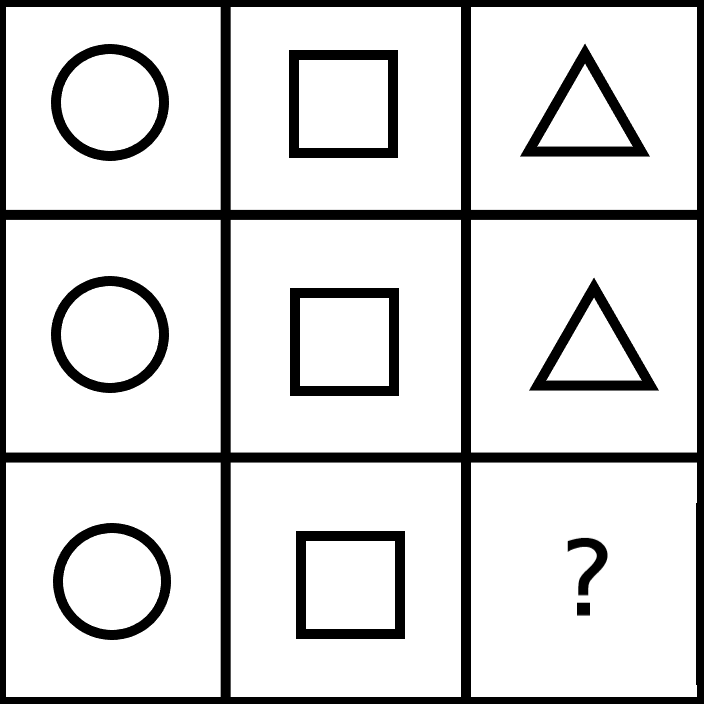 멘사 테스트는 주로 지각 추론(Visual Reasoning)에 중점을 둔다. 언어 능력이나 특정 배경 지식이 없어도 풀 수 있도록 설계된 도형 추리(FRT, Figure Reasoning Test) 방식을 채택한다. 이는 한글을 모르는 응시자나 학습적 배경이 부족한 사람들도 공정하게 테스트받을 수 있도록 고안된 방법이다. 위 사진은 멘사 테스트에 나오는 지각 추론의 형태다. 물론 시험에는 더 어려운 내용이 출제된다.