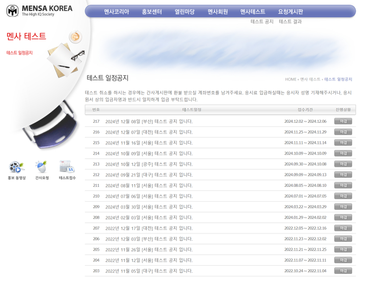 코로나19로 인해 국내 멘사 테스트는 한동안 중단되었으나, 2024년부터 다시 진행된다. 멘사 코리아는 2024년 한 해 동안 서울에서 6회, 부산, 대구, 대전, 광주에서 각 1회씩 총 10회의 테스트를 실시했다. 테스트 응시는 개인당 평생 3회로 제한되며, 불합격 시 재응시는 1년 뒤에 가능하다.