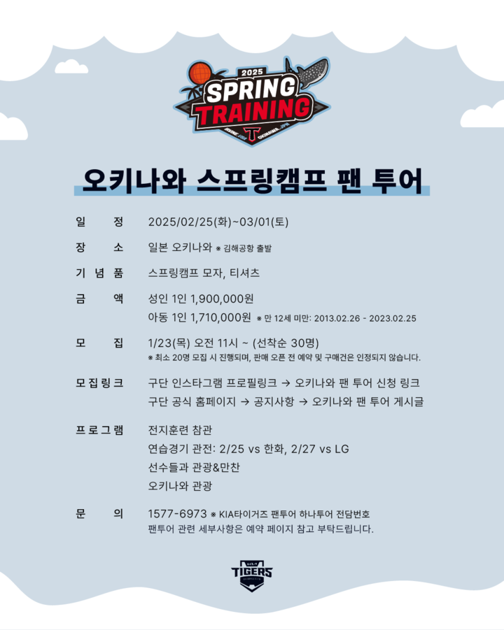 팬 투어는 선착순 30명을 모집하며, 최소 20명 이상 신청 시 프로그램이 진행된다. 모집은 1월 23일 오전 11시부터 KIA 타이거즈 공식 홈페이지와 인스타그램, 그리고 투어 대행사 하나투어 홈페이지를 통해 신청할 수 있다.