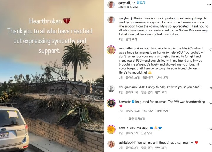 홀은 LA타임스와의 인터뷰에서 “뒷마당에서 연기 기둥을 본 뒤 불과 몇 분 만에 불길이 치솟았다. 시간적 여유가 전혀 없었다”고 당시의 긴박했던 상황을 전했다. 그는 반려견, 당뇨병 관리를 위한 인슐린, 할아버지의 그림 등 최소한의 물건만 챙긴 채 탈출했으며, 현재 가족 집에서 임시로 생활 중이다.
